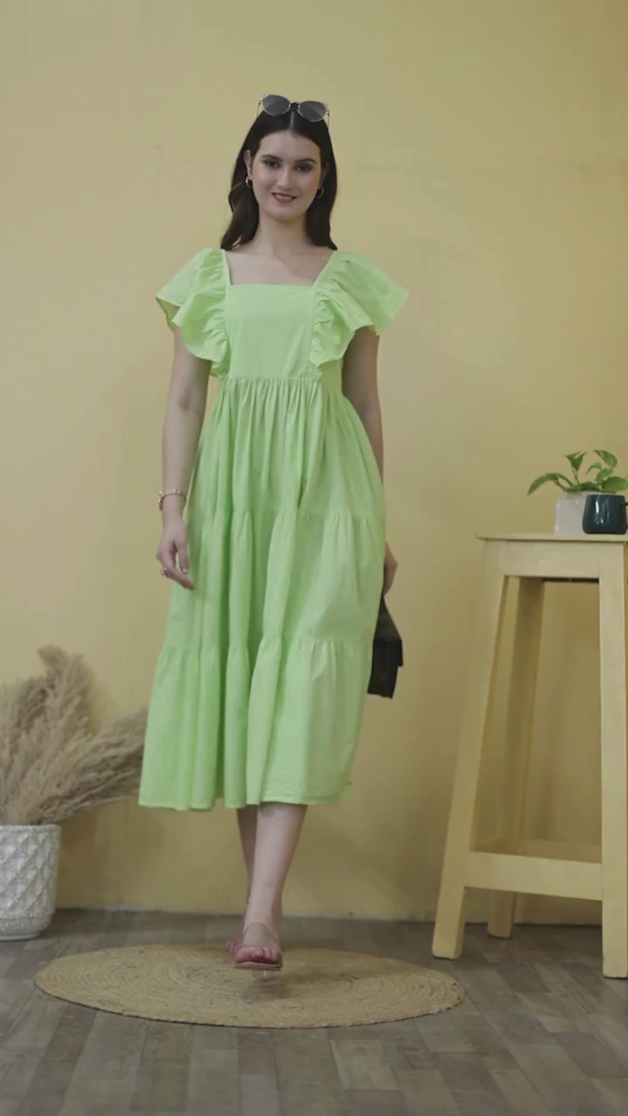 Sweet, sunny days call for a dress like Clover Charm. Crafted in pista green cotton poplin, this tiered midi is all about comfort with a romantic vibe. The ruffled shoulder straps are elasticated for extra support, while the flattering square neckline and flowy silhouette make it your easy-going favourite.