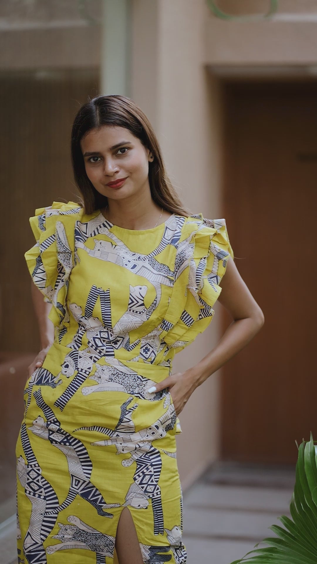 Step into a world of adventurous whimsy with Yellow Yarn Tale, a boat-neck cotton midi that spins tales of wild imagination. Crafted in sunny yellow with intricate blue line drawings of playful animals—from cats to fantastical creatures—this dress captures the spirit of untamed creativity. Lightweight, breathable, and lined for a smooth, flattering drape, it flows with a daring side slit and ruffled shoulders — ideal for artful escapades, vibrant festivals, or sun-kissed explorations.